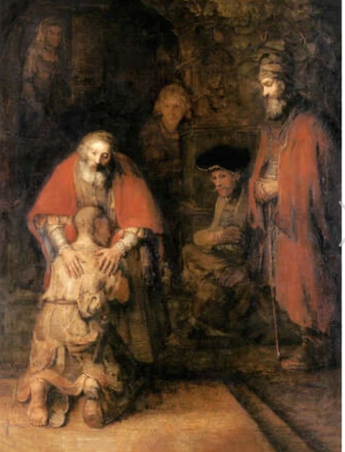 Here we see something different. A son returns after making mistakes. He kneels, unsure and humbled, while his father rests his hands gently on his back. This image reminds us that guilt does not have to lead to rejection. When mistakes are met with compassion, something can soften. Relationships can be repaired.